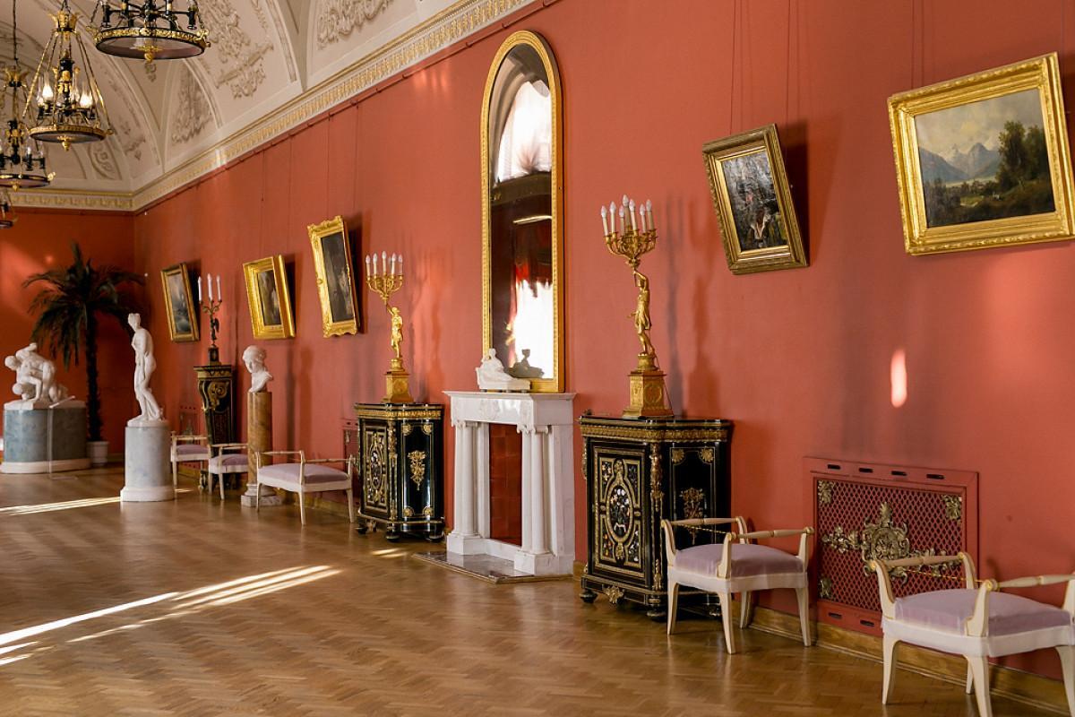 Интерьер дворца, где можно увидеть элементы роскошного оформления и картинной галереи.